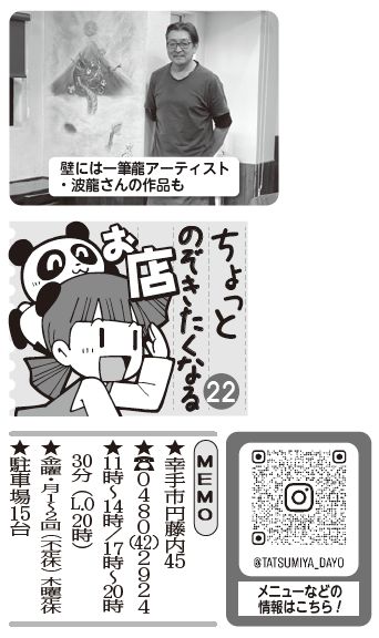 まだ眠っている桜の蕾。厳しい寒さの中で静かに目覚めの時を待っています。今回訪ねた、たつみや食堂も春待ちの一本桜が迎えてくれました。 カフェのような外観。店先のデッキに置かれたフクロウのオブジェもナチュラルで愛らしく、一人でも気軽に入りやすい雰囲気。 「4年前にリニューアル、創業当時からの昭和の食堂からイメージを一新しました」と穏やかな笑顔が印象的な2代目大熊重信さん。 創業当時の昭和44年は高度成長の真っ只中。幸手加須線沿いに開店した食堂には連日、美味しくボリュームある料理を求め大型車の運転手さんを中心に多くのお客様が通い大繁盛。 元々、若い頃から飲食の仕事をし調理師免許を持っていた母の幸子さんが結婚を機に食堂をオープン。会社勤めをしていた父の清治さんも調理師免許を取得し2人で力を合わせ切り盛り。 食堂の2代目として重信さんは、高校卒業後は調理専門学校を経て家族と一緒に厨房に立つことに。調理師免許を持つ3人がそれぞれ得意の料理で切磋琢磨。約50種のメニューに「父ちゃんのもつ煮」「母ちゃんの餃子」そして、重信さん渾身の逸品「ローストビーフ丼」が並びます。 時代が移り環境も変化する中、創業当時からの父の言葉「手を抜かずに手間をかける」は今も変わらずに。