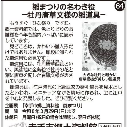 丹たん唐から草くさ蒔まき絵えといい、黒くろ漆うるし地じに金蒔絵で牡丹の花と葉に唐草を配した有ゆう職そく文もん様ようが表されています。 雛道具は、江戸時代の上級武家の婚礼道具を見本としたといわれ、ミニチュアながら精巧に作られ、主に江戸を中心に発展しました。ぜひご覧ください。