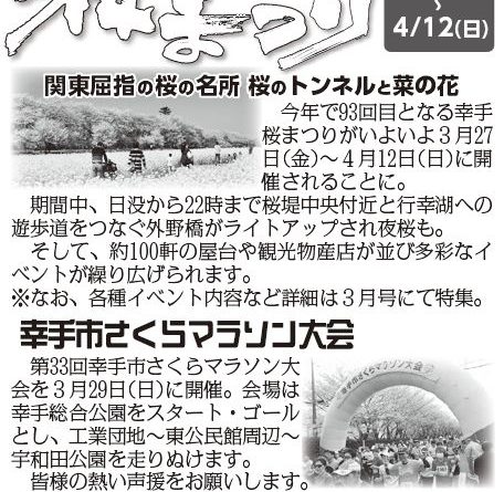 今年で93回目となる幸手桜まつりがいよいよ3月27日(金)~4月12日(日)に開催されることに。期間中、日没から22時まで桜堤中央付近と行幸湖への遊歩道をつなぐ外野橋がライトアップされ夜桜も。 そして、約100軒の屋台や観光物産店が並び多彩なイベントが繰り広げられます。※なお、各種イベント内容など詳細は3月号にて特集。大会に関するお問合せは幸手市さくらマラソン・エントリーセンター?048-778-5880(平日10:00~17:00)まで
