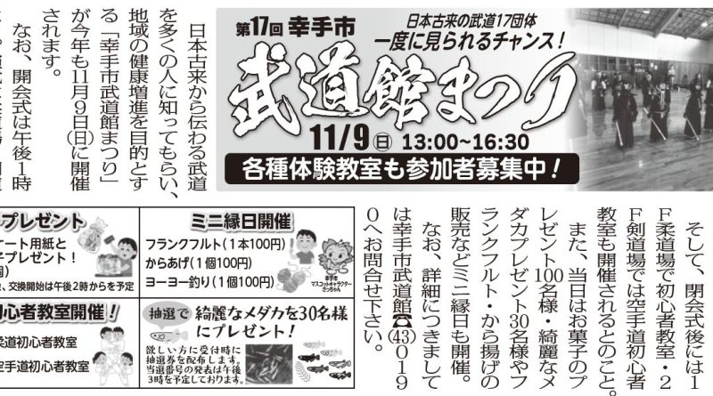 日本古来から伝わる武道を多くの人に知ってもらい、地域の健康増進を目的とする「幸手市武道館まつり」が今年も11月9日(日)に開催されます。 なお、開会式は午後1時より。演武は柔道場・剣道場・弓道場の3会場に分かれ、各団体15分程度披露。