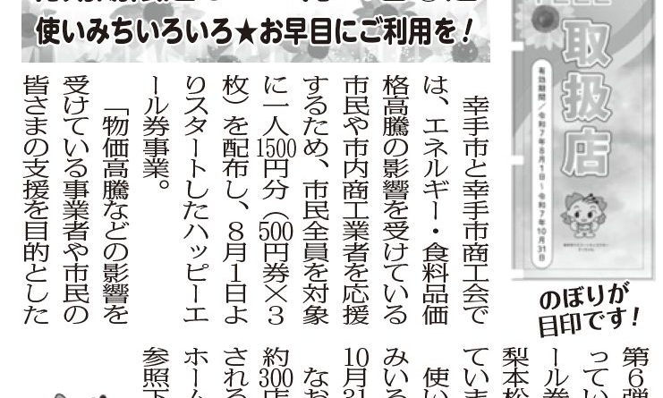 幸手市と幸手市商工会では、エネルギー・食料品価格高騰の影響を受けている市民や市内商工業者を応援するため、市民全員を対象に一人1500円分(500円券×3枚)を配布し、8月1日よりスタートしたハッピーエール券事業。 「物価高騰などの影響を受けている事業者や市民の皆さまの支援を目的とした第6弾です。有効期限が迫っています。お早目に、エール券をご利用下さい」と梨本松男商工会会長は語っています。 使いみちいろいろ・楽しみいろいろ・地元を応援!