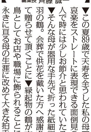 ▼この夏89歳で天寿を全うした私の母▼喜怒哀楽をストレートに表現できる面倒見の良い人で時には少しお節介と思われていたことも▼そんな母が器用な手先で折った紙細工の九羽の鶴。会葬で供花を戴いた方へ感謝を込めて贈らせて頂くことに▼緑起物の鶴が吉祥の鳥としてお店や職場に飾られることに感謝。永きに亘る母の生涯に改めて大きな拍手を!
